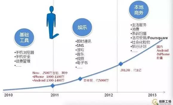 那么進(jìn)入到移動(dòng)互聯(lián)網(wǎng)時(shí)代之后,三波浪潮分別是工具、娛樂(lè)、本地商務(wù)。這點(diǎn)早在2011年的時(shí)候就被人預(yù)言了——?jiǎng)?chuàng)新工場(chǎng)的汪華。他比較早的看清了移動(dòng)互聯(lián)網(wǎng)的幾個(gè)大機(jī)遇,并且梳理出從基礎(chǔ)工具、娛樂(lè)和本地商務(wù)這三個(gè)大階段來(lái)進(jìn)行投資布局。
